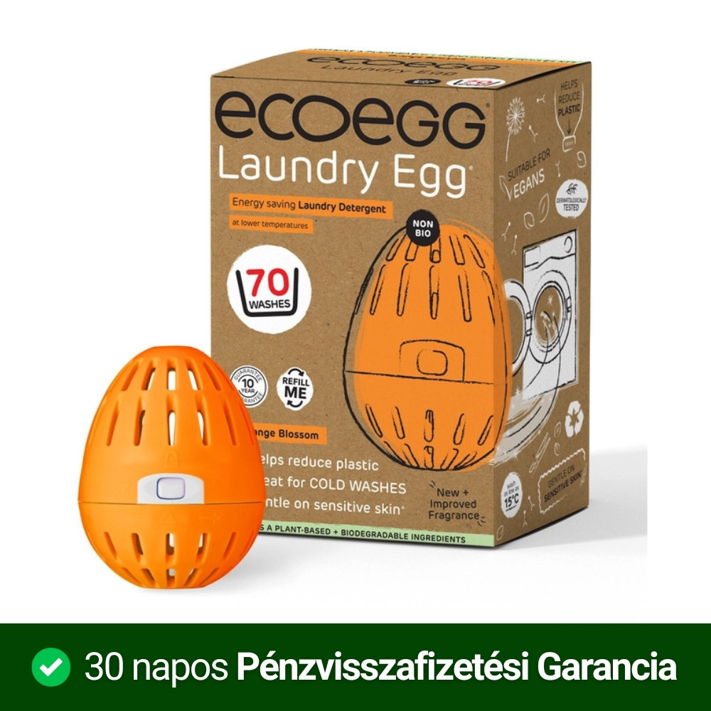 The Ecoegg Laundry Egg is one of the most economical, chemical-free and environmentally friendly laundry options available today. It is ideal for washing both adult and children's clothes. The product is endorsed by Allergy UK and the British Eczema Association. It does NOT irritate the skin and rinses completely out of fabrics, making it suitable for people with eczema. Economical, chemical-free and environmentally friendly washing, which can cost as little as ~72 Ft (depending on the size of the package). Hypoallergenic – contains no harmful ingredients (chemicals, petroleum derivatives, optimising additives, bleaching agents). The outer shell of the Ecoegg laundry egg is made from 100% recycled, flexible rubber, which does not damage your washing machine drum. The laundry egg is currently available in packs of 70, which means that one box contains enough mineral and cleaning balls for 70 washes. This quantity is sufficient for an average family for 4 months. After the first purchase, it is sufficient to buy a refill, which is available in packs of 50. Available scents: Unscented Spring Flower Fresh Cotton Jasmine Orange Blossom British Blooms Tropical Breeze The Ecoegg laundry egg contains scientifically developed, patented cleaning balls. There are two types of cleaning balls in the laundry egg: Dark-coloured: a crystalline mineral (tourmaline) that helps remove dirt from textile fibres. White: balls made of a washing soda-based cleaning agent. These ionise the oxygen molecules in the water, allowing them to penetrate the textile fibres and remove dirt from them. Washing takes place without fading or damaging colours. The best washing results are achieved by using both types of balls together, as proven by scientific studies. It is extremely easy to use: place the balls (3 white and 1 grey) in the ecoegg Laundry Egg and place the egg in the drum of your washing machine. The ionised oxygen molecules raise the pH value of the water, which means they have a water softening effect. It can be used effectively even at low temperatures. It can be used for coloured and white clothes as well as 'delicate' fabrics. Use at a maximum temperature of 60 degrees! Do not use for boiling clothes! Washing tips: Do not overfill the washing machine drum so that the washing egg can move freely during washing. If you want to add fragrance to your laundry, we recommend using laundry perfume. Before using the Ecoegg for the first time, it is advisable to thoroughly clean the washing machine with a 90°C cleaning cycle (+vinegar) or with the Ecoegg Washing Machine Cleaner Tablet. Ingredients Sodium C14-16, Olefin, Sulfonate, Sodium Carbonate, Calcium Carbonate, Sodium bicarbonate, Emulsifier, Sodium metasilicate, Sodium citrate, Cellulose gum, Fragrance
