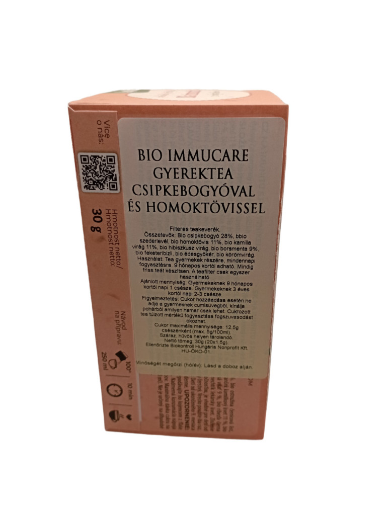 BIO IMMUCARE GYEREKTEA CSIPKEBOGYÓVAL ÉS HOMOKTÖVISSEL Filteres teakeverék. Összetevők: Bio csipkebogyó 28%, bio szederlevél, bio homoktövis 11%, bio kamilla virág 11%, bio hibiszkusz virág, bio borsmenta 9%, bio feketeribizli, bio édesgyökér, bio körömvirág. Használat: Tea gyermekek részére, mindennapi fogyasztásra. 9 hónapos kortól adható. Mindig friss teát készítsen. A teafilter csak egyszer használható.